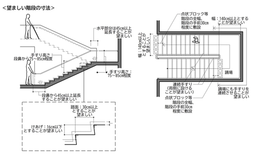 2025年5月に国土交通省が公表した「高齢者、障害者等の円滑な移動等に配慮した建築設計標準」において、高齢者や障がい者の方に配慮した階段寸法の基準が上記画像とともに公開されています。