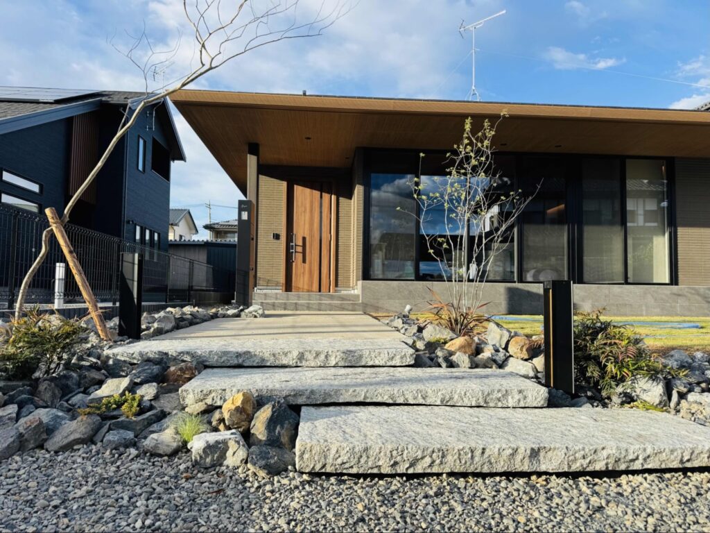 前橋市の住宅では自然石を階段も含めたアプローチ全体に用いて、機能的で統一感のあるデザインに仕上げました。