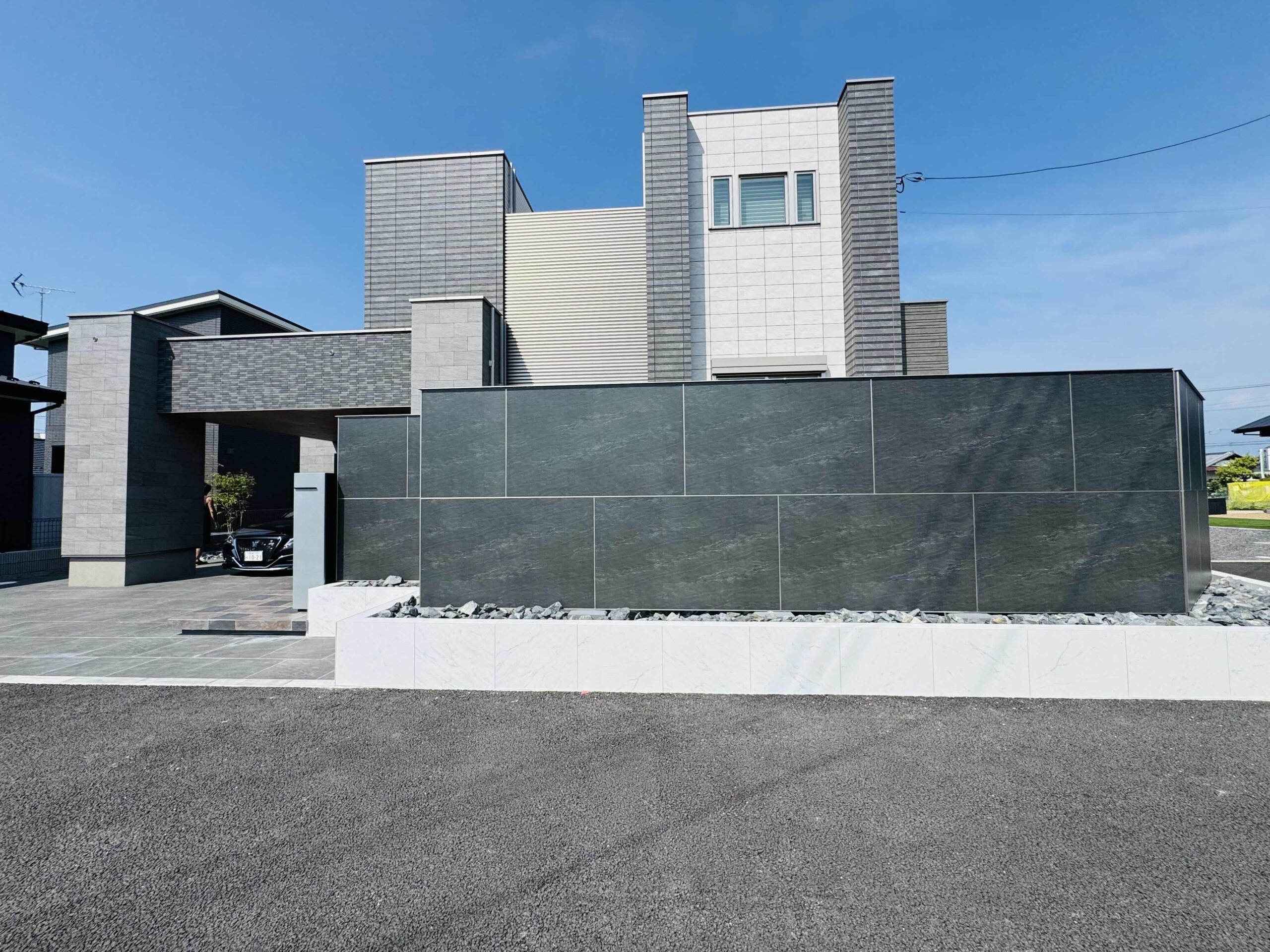 駐車場廻りには魅力的な自然石風のグレ‐系タイルを採用しました。