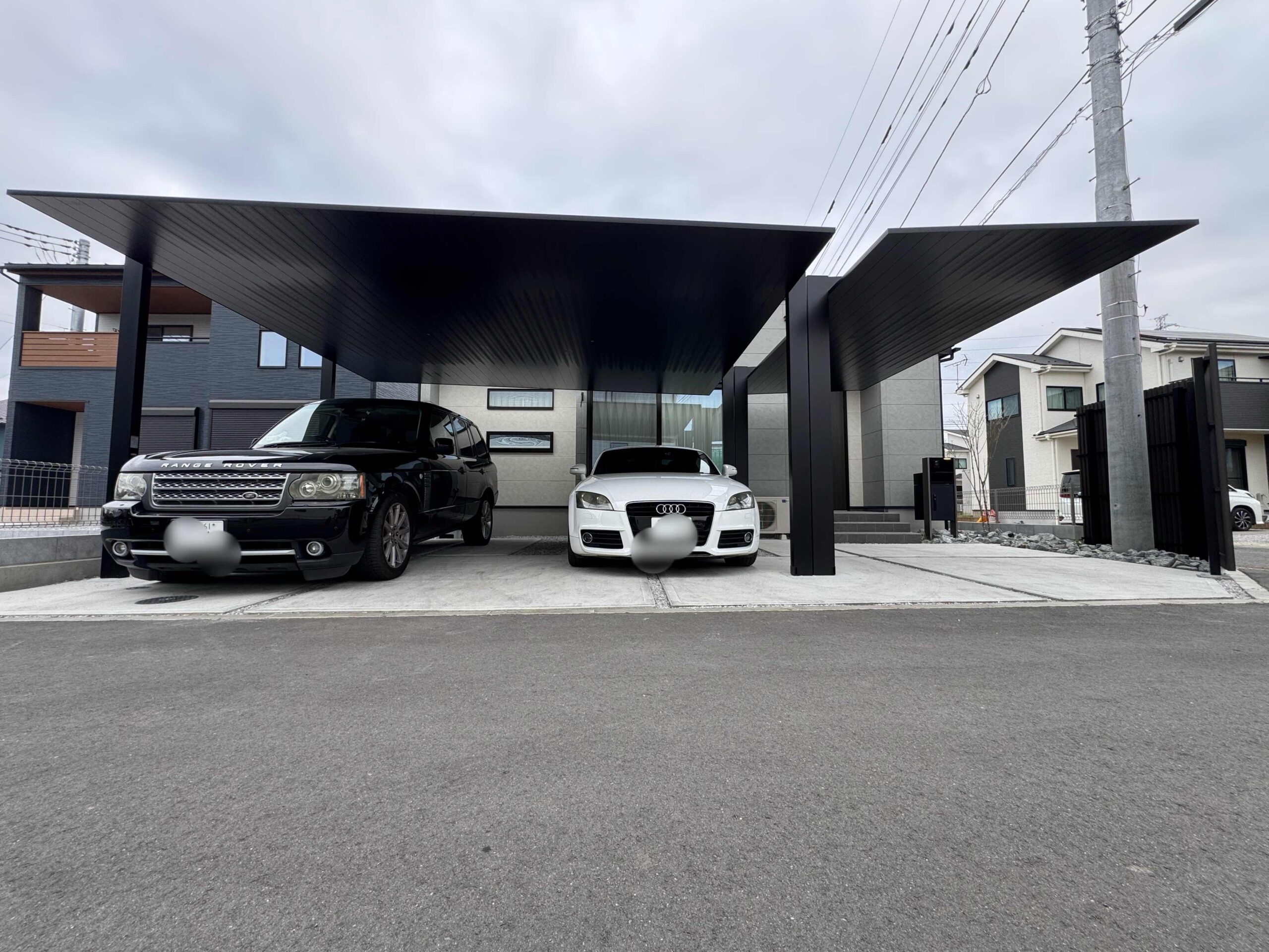 モノクロの住宅に統一させた玄関まで直列の機能的なシンプル・カーポート