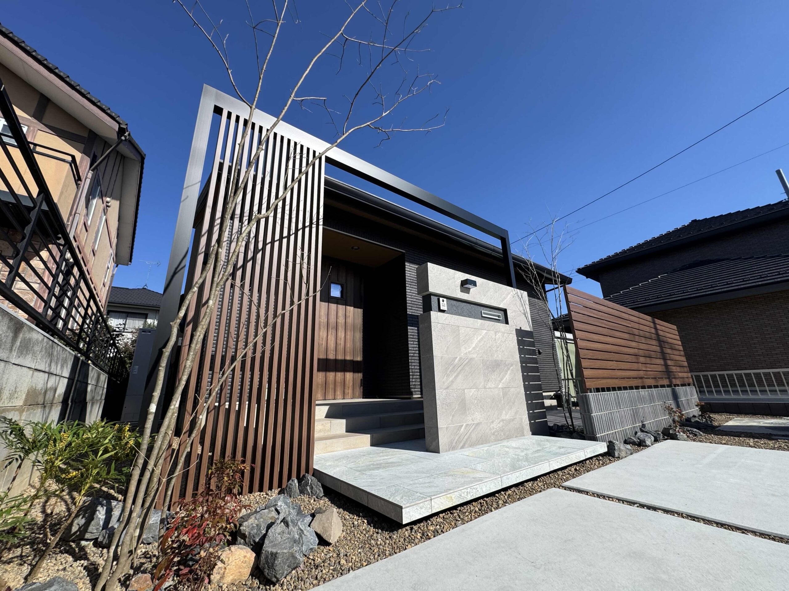 玄関正面には、縦格子フェンスを使い意匠性を高めつつ目隠しをしました。